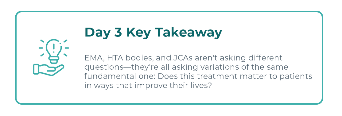 The workshop explored how pharmaceutical companies can address these EMA requirements alongside HTA and JCA needs. The discussion highlighted that regulatory requirements, HTA evidence needs, and patient research shouldn't be treated as separate challenges. They're different stakeholders asking variations of the same fundamental question: Does this treatment matter to patients in ways that improve their lives?